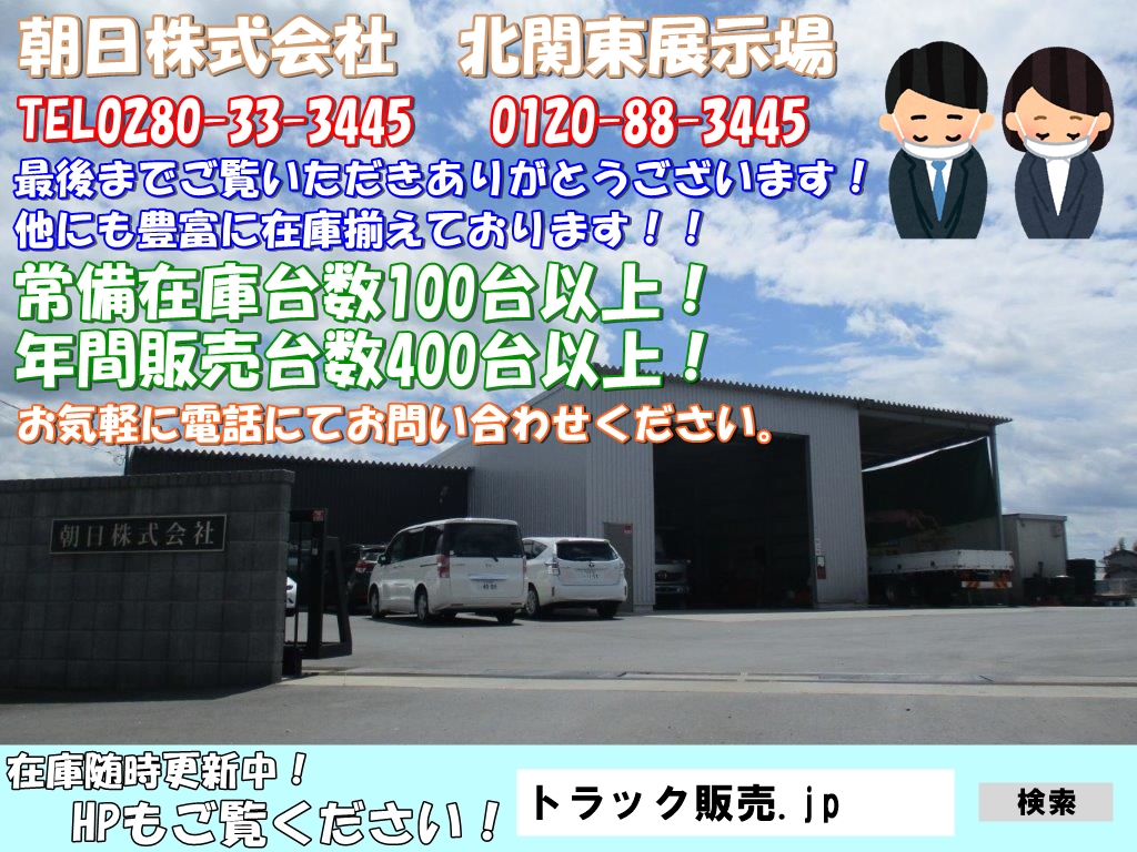 注)★記載の数値(走行距離・寸法・重量・積載量)は掲載時点の数値です。新規・継続検査時に減トン及び構造変更が必要となる場合がございます。★中古車の為、小キズ・凹み等画像では確認できない部分もあります。